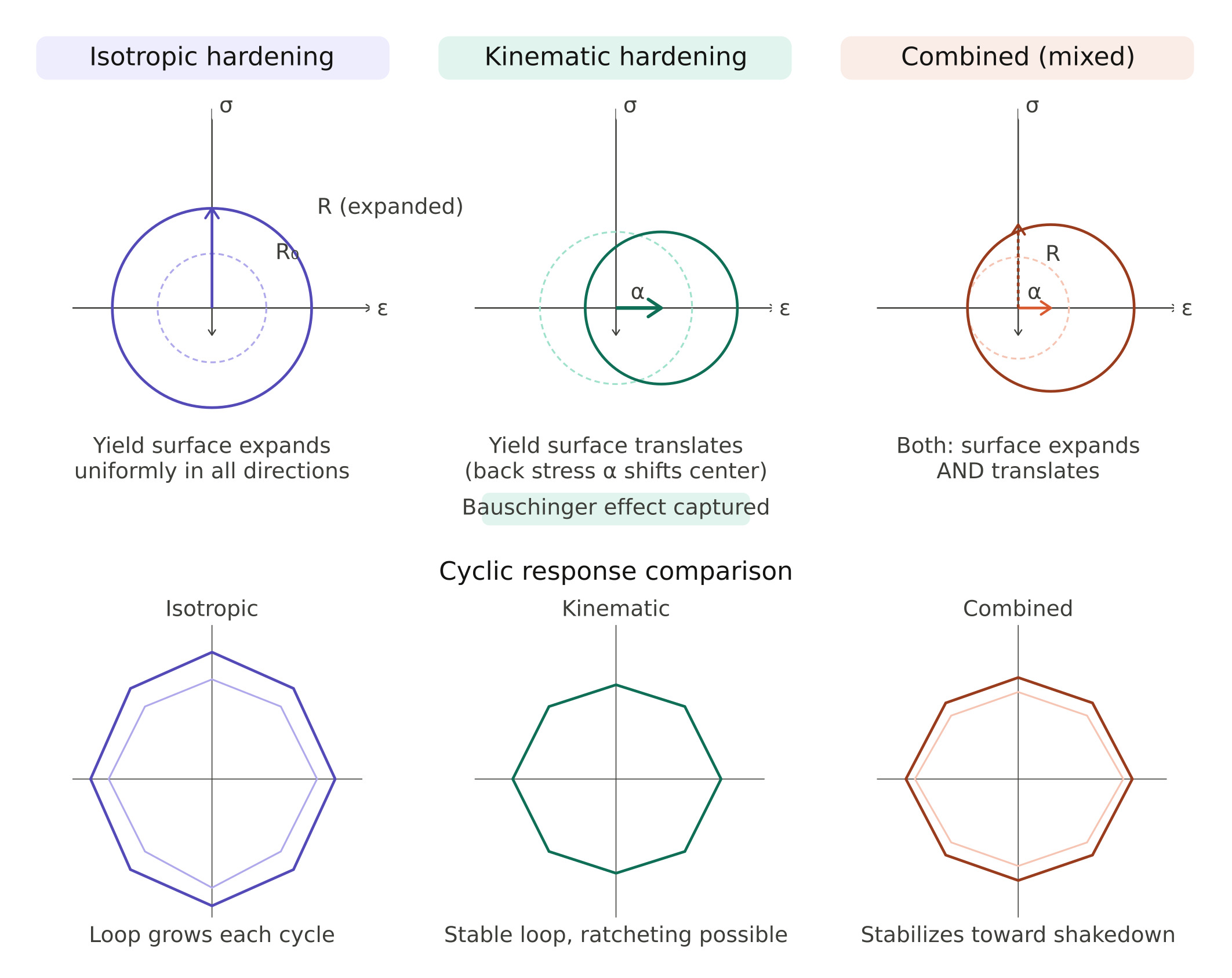 Görseldeki ilk panelde gördüğünüz gibi, akma yüzeyi (mavi daire) her yöne homojen bir şekilde büyür. Merkez sabit kalır. Bu, çevrimsel yükleme altında stres-şekil değiştirme çevrimlerinin her çevrimde daha büyük gerilme seviyelerine ulaşmasına neden olur (Loop grows each cycle).